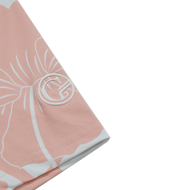 Bring a fresh tropical touch to the course with this Gutty golf polo, featuring a Soft Pink base adorned with a blend of bold leafy shapes and delicate white foliage. Subtle hibiscus silhouettes outlined in the base colour add an elegant island-inspired detail, creating a refined yet playful look. Crafted from a premium blend of 88% polyester and 12% spandex, the polo uses lightweight 180gsm fabric that feels breathable and comfortable all day long. The 4-way stretch construction allows for smooth, unrestricted swings, while its moisture-wicking properties keep sweat away so you stay cool and focused. Built with UPF 50+ protection, it also helps shield you from the sun during long rounds outdoors.